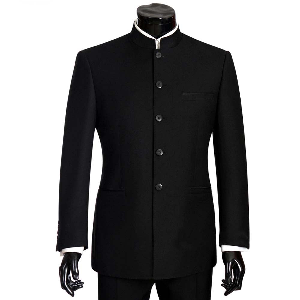- The single-breasted blazer with mandarin collar features two side pockets, a single inner pocket, full cotton-blend lining, buttoned cuffs, high shine black resin buttons.