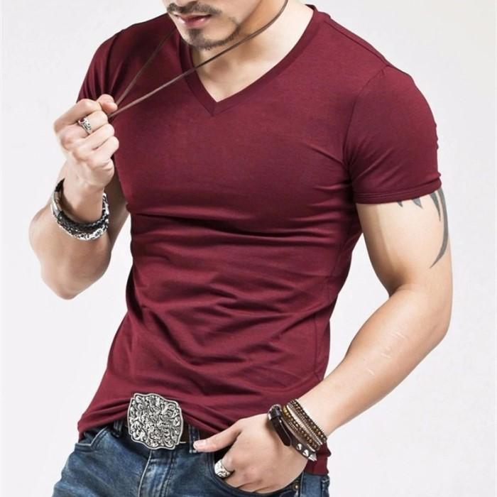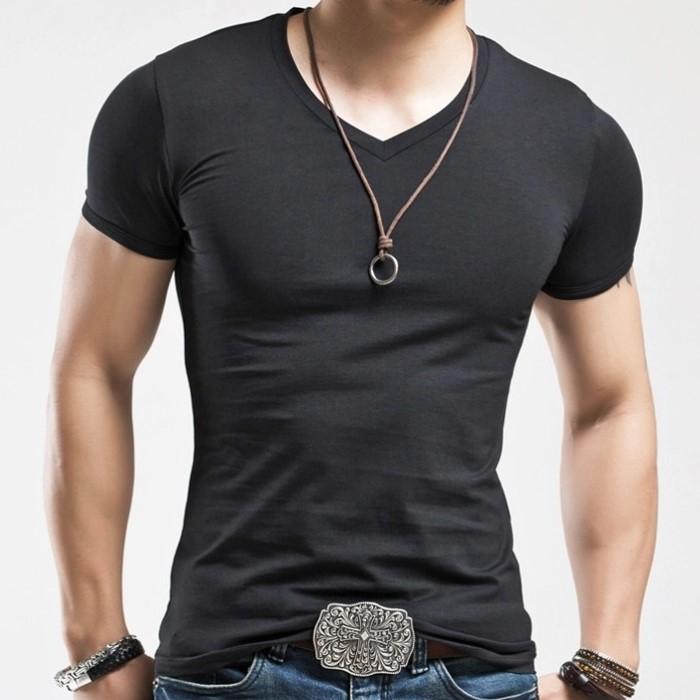 Tight-fitted skinny T-shirt with O-neck and short sleeves. Plain-colored, made of knitted fabric.
