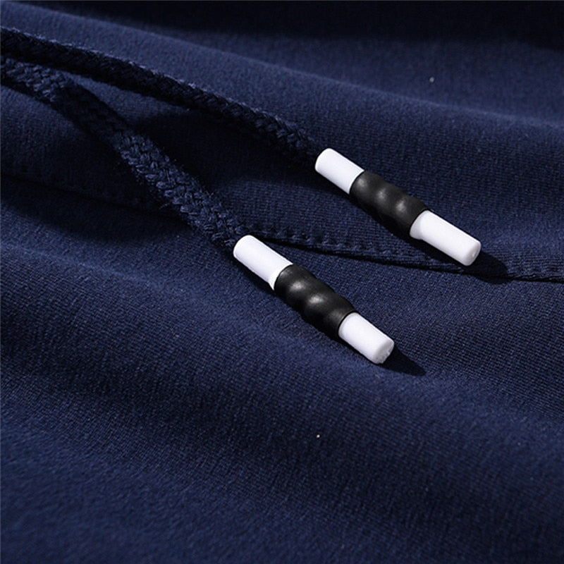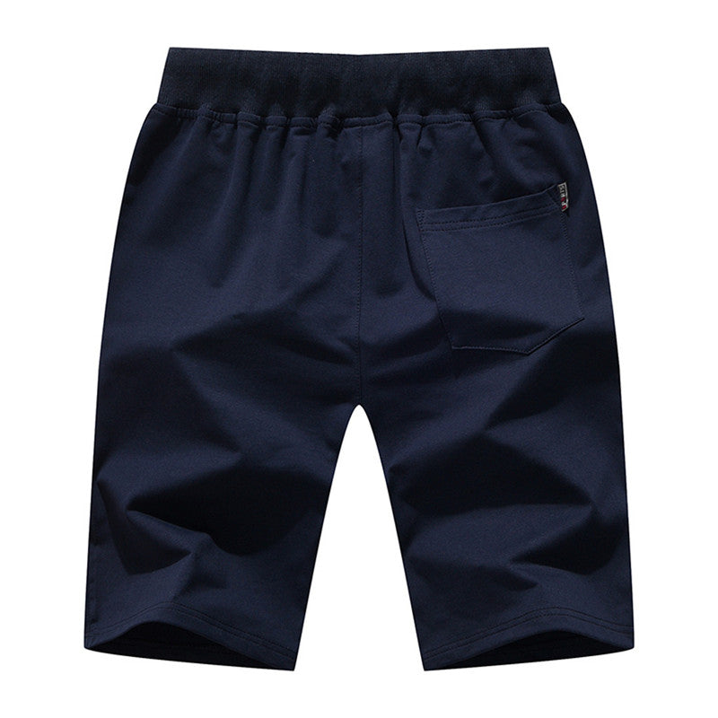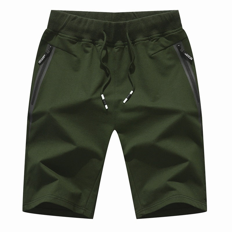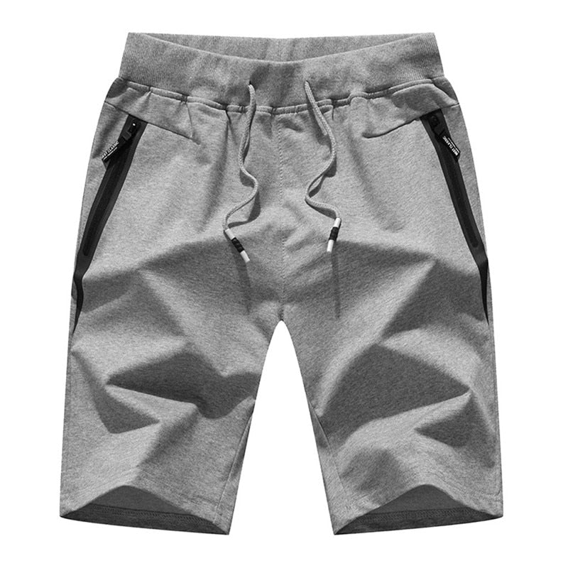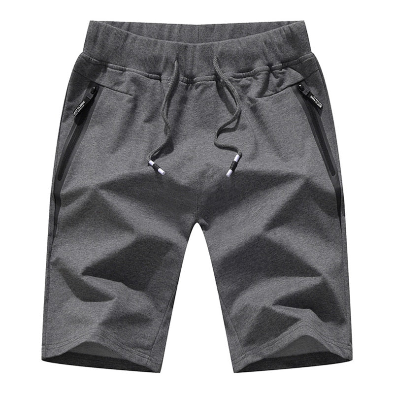 A pair of knee-length stretch knit shorts with a ribbed waistband. It features a drawstring waist, two hand pockets with zipper closure, and a single welt back pocket.