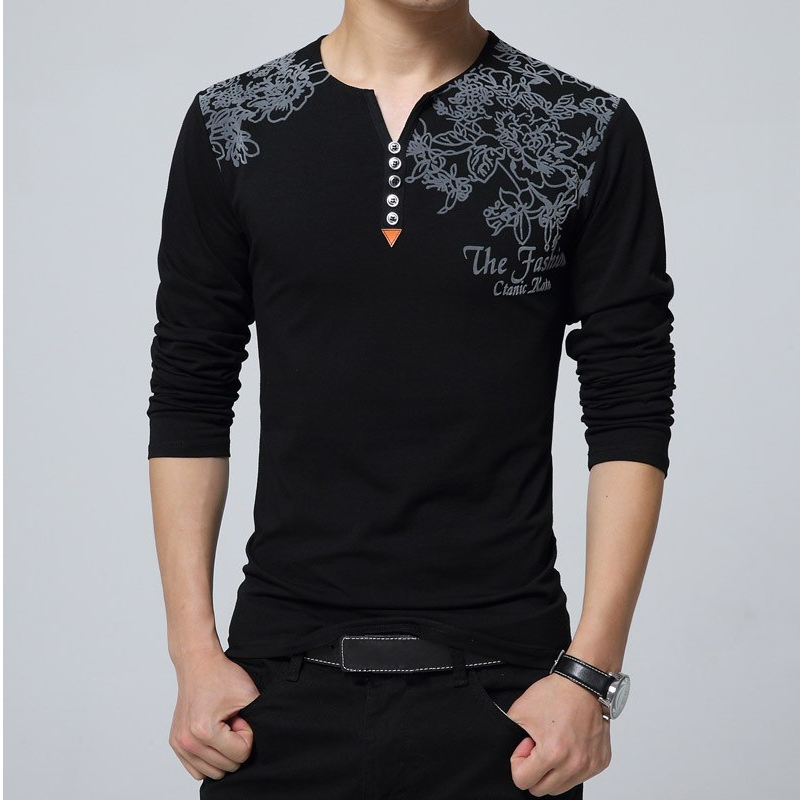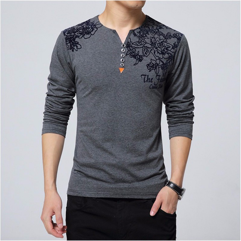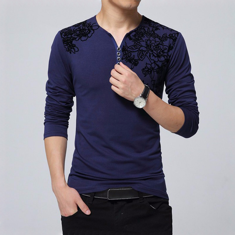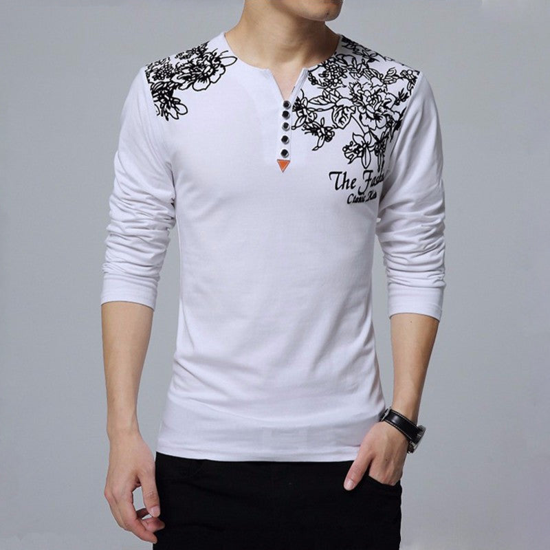 Long-sleeved t-shirt crafted from skin-friendly cotton rich fabric. Features a floral print on the front, partial button placket and a regular fit.